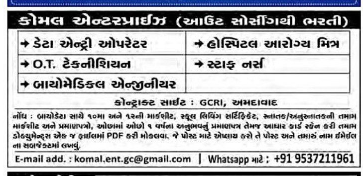 કોમલ એન્ટરપ્રાઈઝીસ દ્વારા વિવિધ પદોની ભરતી માટેની વિગતો નીચે આપેલી છે: