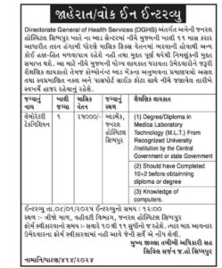 ડિરેક્ટોરેટ જનરલ ઓફ હેલ્થ સર્વિસેસ (DGHS) હેઠળ સિદ્ધપુર જનરલ હોસ્પિટલના બ્લડ સેન્ટર માટે 11 મહિના માટે અને માસિક નક્કી પગાર પર લેબોરેટરી ટેકનીશિયન પદ માટે ભરતી કરવામાં આવશે. આ પદ માટે અન્ય કોઈ હક અને લાભ ઉપલબ્ધ નહિ રહેશે અને સમયગાળા પૂરું થવામાં ભરતી બંધ થઈ જશે. ઉમેદવારોને નીચે આપેલા તારીખે તેમના પોતાના ખર્ચે જરૂરી દસ્તાવેજો સાથે આવવું પડશે.