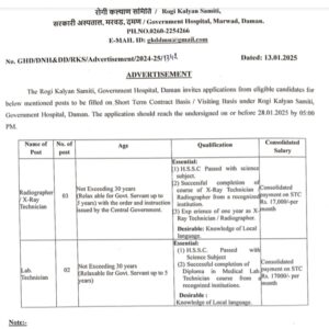 રોગી કલ્યાણ સમિતિ, સરકારી હોસ્પિટલ, દમણને શોર્ટ ટર્મ કોન્ટ્રાક્ટ બેઝિસ / વિઝિટિંગ બેઝિસ પર ભરી કરવા માટે લાયક ઉમેદવારો પાસેથી અરજીઓ આમંત્રણ કરી છે. આ પદો માટે અરજીઓ 28.01.2025, 05:00 PM પહેલા સબમિટ કરવાની છે.