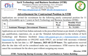 સાવલી ટેકનોલોજી અને બિઝનેસ ઇન્ક્યુબેટર (STBI) દ્વારા 11 મહિના માટે (3 વર્ષ સુધી વિસ્તરણની સંભાવના સાથે) કરાર આધારિત પદ માટે અરજીઓ આમંત્રિત કરવામાં આવી છે.